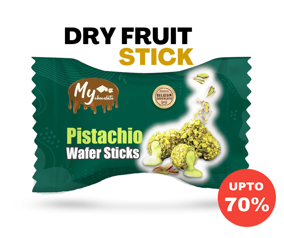 A crispy biscuit stick filled with flavored cream, coated in rich Belgium chocolate, and topped with High Quality crushed Pistachio and almonds for the perfect crunch. A delightful treat in every bite! 🍫✨